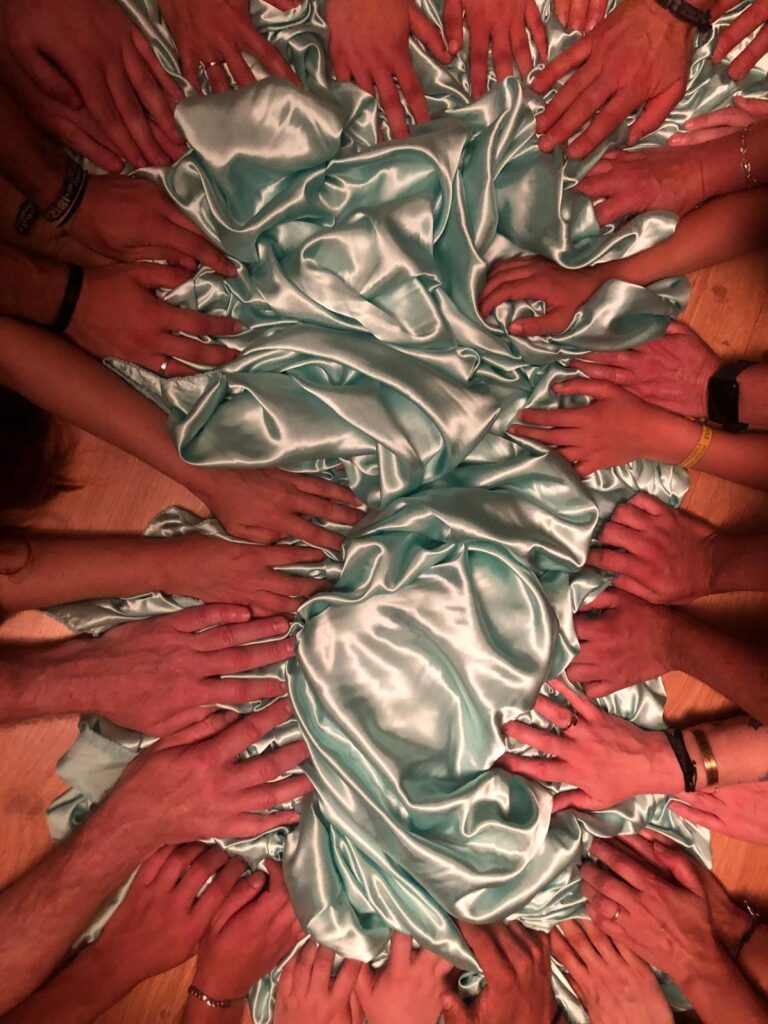 Pozostali zaczynają go poruszać, tworząc fale. Materiał ożywa — staje się symbolem wody, choć nadal jest sztuczny.